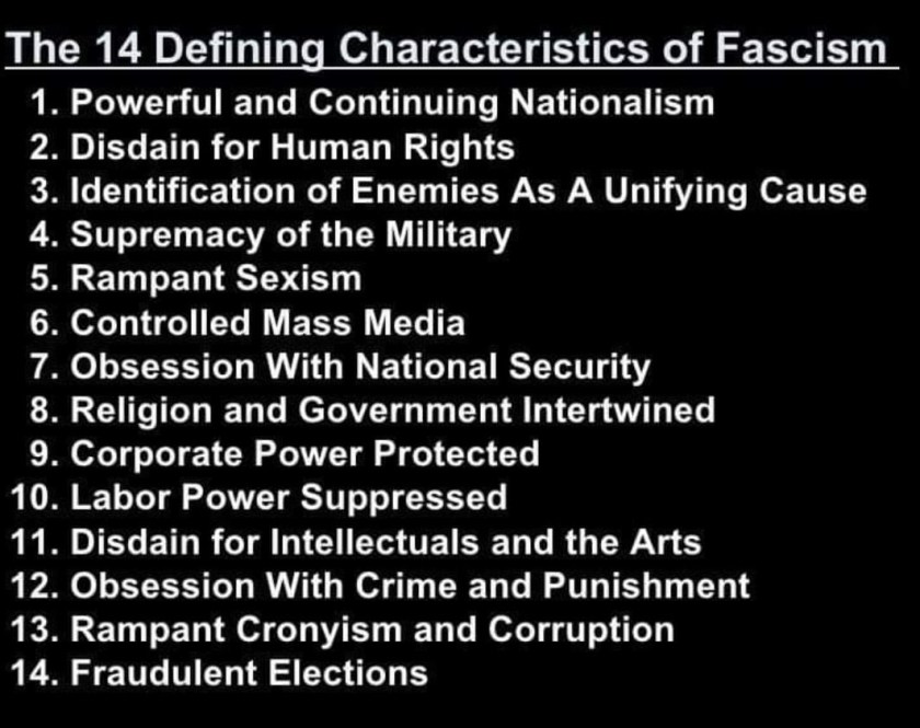 So some of these things are fairly broad in civilizations in general. Some are common to totalitarian societies of all stripes (fascist or otherwise) and generally accused by folk like antifa against folk to whom they don’t apply. None of them–not one–is specific to fascism.